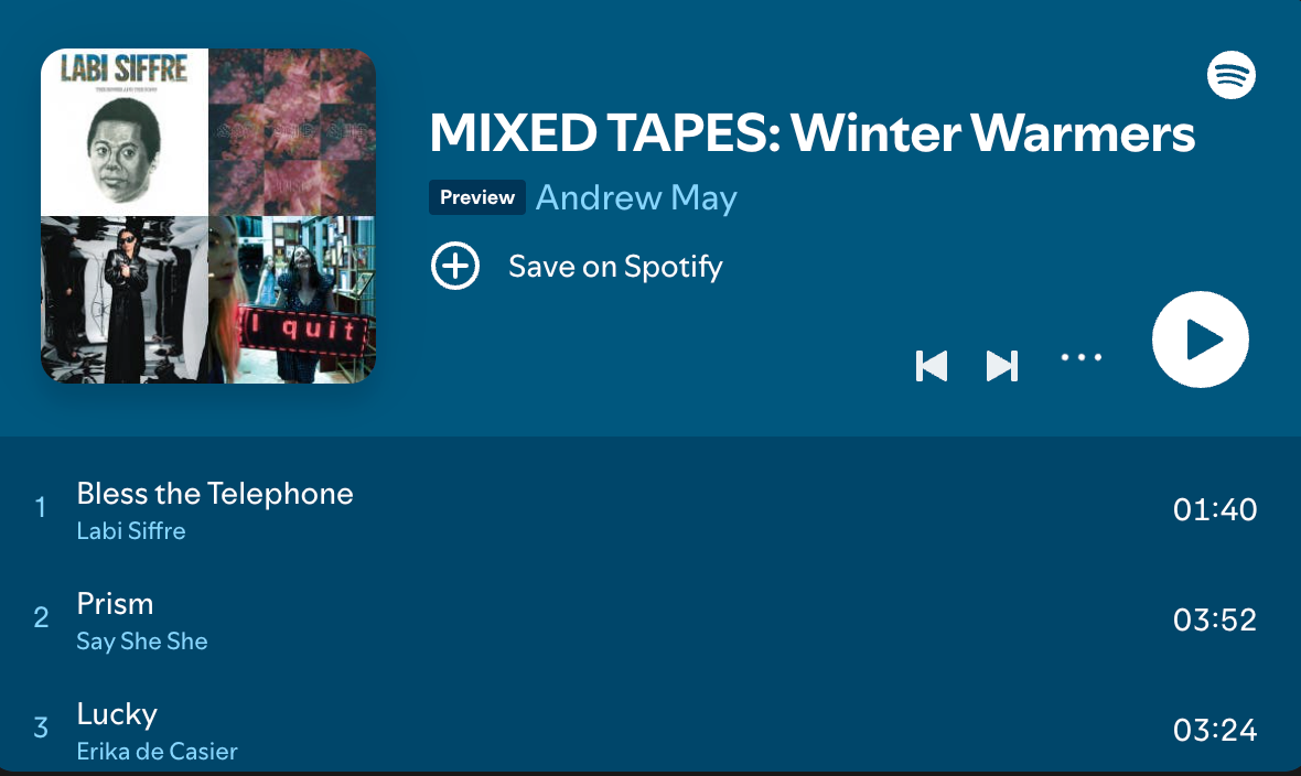 This weeks playlist is meant to be a balm – an antidote to grey skies and slushy commutes.